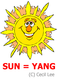 The female principle of yin is associated with the earth, with the North and cold. Originally, Yin  means `shady side' which is the side of a mountain which is not facing the sun. The word is also used to mean the dark, cold room in  which ice was stored in summer. Yang is related to Heaven, South, the  Emperor, the dragon and all uneven numbers are yang-numbers.